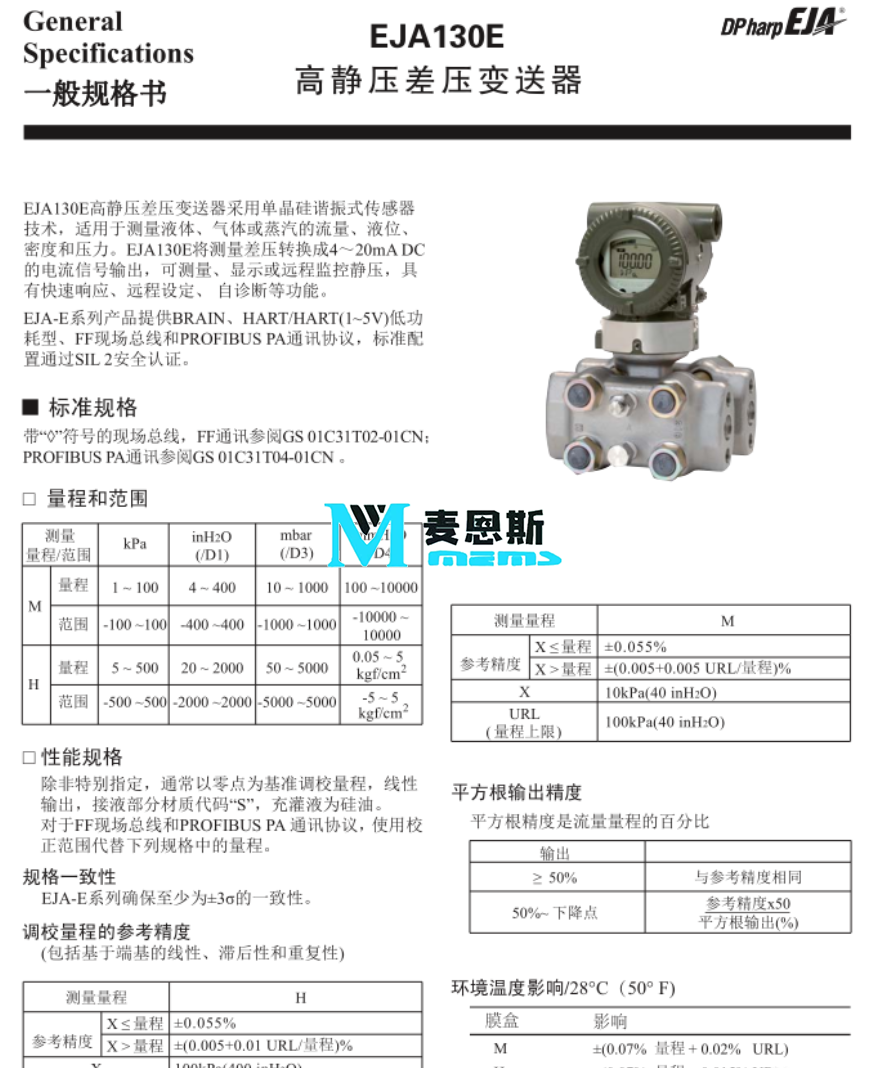 橫河川儀EJA130E高靜壓差壓變送器詳細介紹